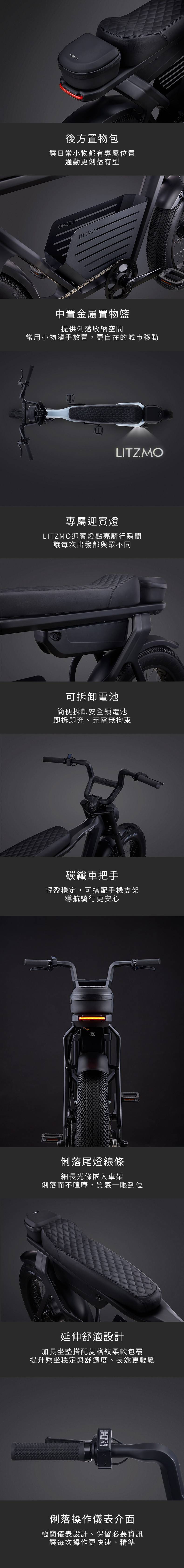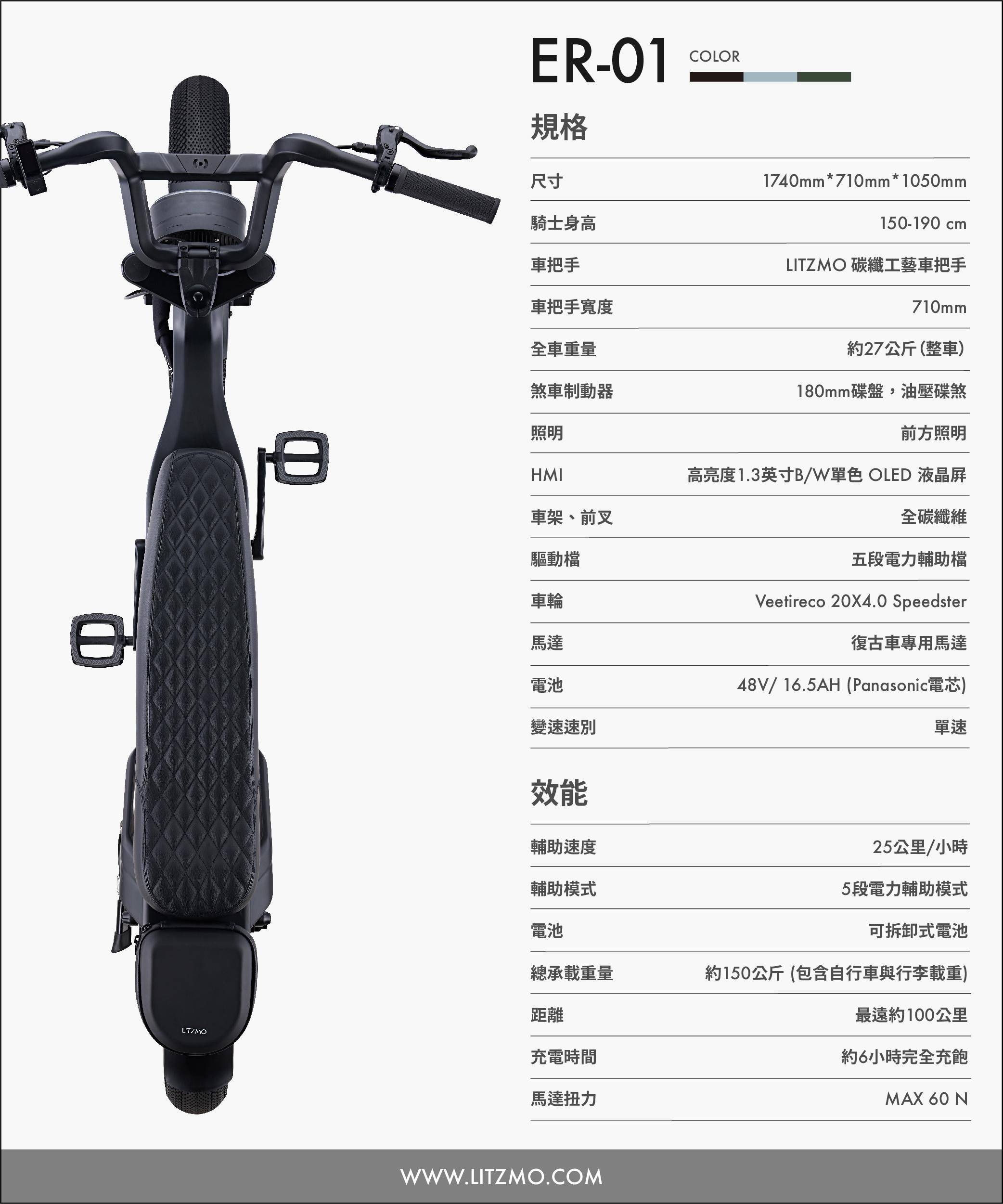 如果你在找一台視覺霸氣、但牽起來卻意外輕盈的電輔車,那這台 LITZMO ER-01 絕對是目前市場上的頂級首選。它最狂的地方在於它是「全球首款全碳纖維車架」的 20x4 胖胎車。一般這種粗獷的胖胎車,車重隨便都突破 35 公斤,但 ER-01 靠著全碳纖維車架,整車僅 27 公斤,是目前同級市面上最輕的車款,這對於進電梯、挪車位來說,負擔感真的小非常多。